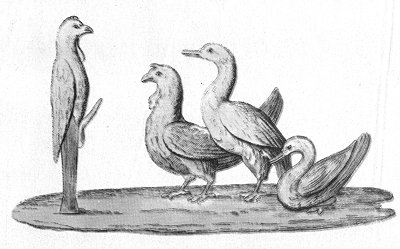 A PRIAPUS-HERMES, in the form of a cock, is receiving the worship of three birds--a turkey-cock, a goose, and a duck.
