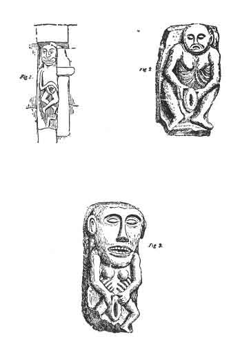 to view in the most unequivocal manner, and are carved on a block which appears to have served as the key-stone to the arch of the door-way of the church, where they were presented to the gaze of all who entered. They appear to have been found principally in the very old churches, and have been mostly taken down, so that they are only found among the ruins. People have given them the name of Shelah-na-Gig, which, we are told, means in Irish Julian the Giddy, and is simply a term for an immodest woman; but it is well understood that they were intended as protecting charms against the fascination of the evil eye. We have given copies of all the examples yet known in our plates V and VI. The first of these 21 was found in an old church at Rochestown, in the county of Tipperary, where it had long been known among the people of the neighbourhood by the name given above. It was placed in the arch over the doorway, but has since been taken away. Our second example of the Shelah-na-Gig 22 was taken from an old church lately pulled down in the county Cavan, and is now preserved in the museum of the Society of Antiquaries of Dublin. The third 23 was found at Ballinahend Castle, also in