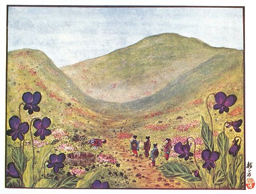 [paragraph continues] Shimizutani, accompanied by four servants. All were out for a picnic, and all, of course, were in search of wildflowers. O Shingé San was the daughter of a Daimio who lived in the neighbourhood. Every year she was in the habit of having this picnic, and coming to Shimizutani at the end of April to hunt for her favourite flower, the purple violet (sumire).