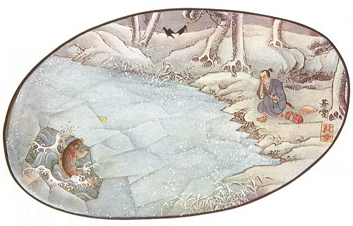 Rosetsu watched its persistency with admiration. The fish tried every imaginable device. Sometimes it would make a determined attack on the ice where the biscuit lay from underneath, by charging directly upwards; at other times it would jump high in the air, and hope that by falling on the ice bit by bit would be broken away, until it should be able to reach the sembei; and indeed the carp did thus break the ice, until at last he reached the prize, bleeding and hurt, but still rewarded for brave perseverance.
