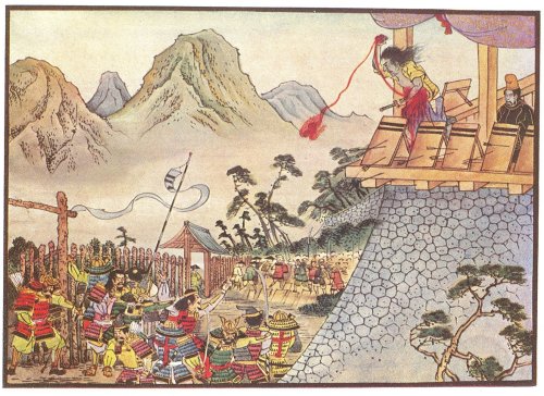 Two days later the party reached Yoshino, and in the vicinity of this place they built a fortress, where for some months they dwelt in peace. It was not long, however, before the Regent heard of the prince's whereabouts, and he soon sent a small army after him. For two days the fort was desperately attacked; on the third the outer gates were taken; two-thirds of the prince's men were dead'. Murakami, had been wounded three times, and his life could not last long. Faithful to the end, he rushed to his prince, saying, 'Master, I am wounded unto death. In less than half-an-hour our enemies will have conquered us, for we have but few men left. Your Highness is unwounded, and can in disguise escape when the end comes. Give me quick your armour, and let me pretend that I am your Highness. I will show our enemies how a prince can die.'