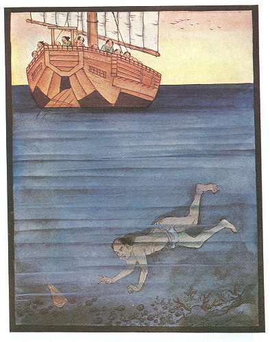 Carefully returning to the surface, Iganosuke scrambled on board, and handed the pipe-end to the grateful young samurai, who, with the old one, bowed to the ground.