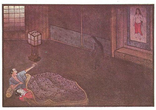On the first night that it was hung Sawara had a dreadful dream. On awakening he found the figure on the kakemono seemed to be alive: the ghost of O Kimi stepped out of it and stood near his bed. Night after night the ghost appeared, until sleep and rest for Sawara were no longer possible. There was nothing to be done, thought he, but to send his wife back to her parents, which he did; and the kakemono he presented to the Korinji Temple, where the priests kept it with great care and daily prayed for the spirit of O Kimi San. After that Sawara saw the ghost no more.