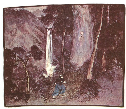 A few days later Tamae, the sixteen-year-old daughter of Kinsaku, who was secretly in love with the son of the village Headman, was awaiting him in the temple grounds, standing the while by the stone figure of Jizodo (Sanskrit, Kshitigarbha, Patron of Women and Children). Suddenly there stood near Tamae a handsome youth of twenty-three years, as in the case of O Kimi; she was greatly struck by the youth's beauty, so much so that when he took her by the hand and led her off she made no effort to resist, and she also disappeared.