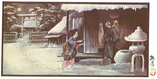 Not very late in the evening there was a knock at the shutters. Kihachi, not wishing to get out of his warm bed, shouted: 'Who are you? Come back in the morning. I do not feel well enough to get up to-night.'