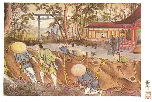 One day the tree was felled; but, instead of withering or dying, it continued to grow, and it is still flourishing, though lying on the ground. Poor Hamada Tsushima disembowelled himself when the sacred tree had been cut down. Perhaps it is because his spirit entered the sacred tree that the tree will not die. Here is the story:—
