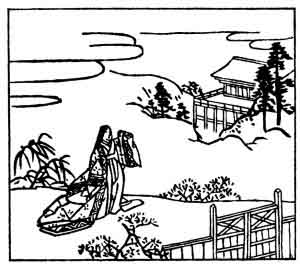 The Lady Ukon is supposed to have been deserted by her husband, and in this poem she regrets, not so much her own sorrow, as the fact that he has broken his sworn oath, and is therefore in danger of divine vengeance. The illustration shows her all alone at the gate, with the house in the background, evidently waiting for the husband who has forsaken her.