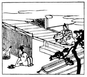 The author was the son of the Minister Yorimoto, and he lived during the latter part of the tenth century. The illustration shows the watchman outside the Palace tending his fire.