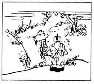 This poet was the father of the writer of verse No. 64, and was a member of the Fujiwara family at the zenith of their power; he was a great statesman and scholar, and died in the year 1041. The verse was written in praise of a waterfall that had been made by the orders of the Emperor Saga early in the ninth century, but which had by this time ceased to exist; and the illustration well shows the watercourse now run dry.