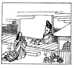 This lady lost her mother when very young, and her father, the minister Toyonari Fujiwara, married again. Her skill at composing verses caused her stepmother to become jealous, and the latter treated her with great cruelty. She married Nobutaka, a nobleman, and the following verse was written by her daughter. She is famous in Japanese literature as the authoress of Genii Monogatari, a historical work in fifty-four sections, which she wrote in the monastery of Ishiyama, near Kyōto. She was one night taking a moonlight stroll on her verandah and caught sight of her lover; but, though she barely recognized him, the Kokinshiu, from which the verse is taken, adds that you are to understand that her reputation was overshadowed from that moment, like the moon behind the clouds. She died in the year 992.