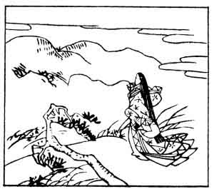 The name given above is only a title, and the real name of this lady is unknown; she was the daughter of the writer of the previous verse, and the wife of Daini Nariakira. The picture shows her on the moor composing the verse. Note the echoing sound in the last line, 'Wasure yawa suru.'