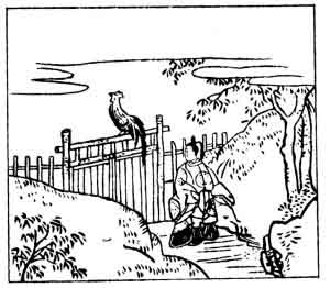 The Lady Sei, Shō-nagon being merely a title, was the daughter of the writer of verse No. 42, and the authoress of Makura-no-Sōshi, or 'A story book to keep under one's pillow'; she was, with the writer of verse No. 57, one of the greatest of Japanese authors. She was a lady-in-waiting at Court, and retired to a convent in the year 1000. This verse has reference to the Chinese story of Prince Tan Chu, who was shut up with his retainers in the town of Kankokkan; the city gates were closed from sunset to cockcrow, but during the night one of the Prince's followers so successfully imitated the crowing of a cock, that the guards, thinking it was daybreak, opened the gates, and the fugitives escaped under cover of the darkness. It is related, that the Emperor once noticed Lady Sei admiring the freshly fallen snow, and asked 'How is the snow of Korohō?' She at once raised the window curtain, showing that she recognized the allusion to the verse 'The snow of Korohō is seen by raising the curtain'.