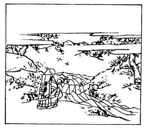 The poet's lay name was Nagayasu Tachibana; he was the son of Motoyasu Tachibana, the Governor of the Province of Hizen. Mount Mimuro and the Tatsuta River are both in the Province of Yamato, not far from Nara. The picture is not very clear, but the river is plainly depicted, and maple leaves are scattered all around.