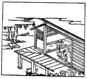 This priest was the son of the author of verse No. 74. He describes in this poem a sleepless night, when he looks in vain to catch the first glimpse of daybreak through the joints of the sliding screens, that form the walls of a Japanese house. But in the picture, as will be noticed, one of the sliding screens is removed, in order to show the priest within.