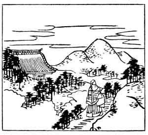 In the picture we see the Archbishop in his robes, and the great Temple of Mount Hiei, while in the distance are: the wild hills where he longs to be.