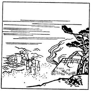 The illustration shows two men carrying pails of sea-water to the salt-pans.