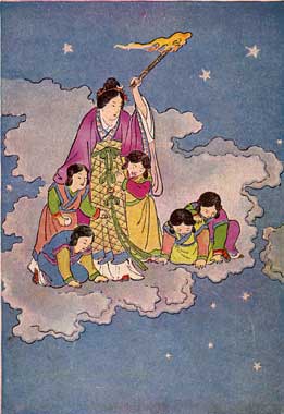 Just then the fairy mother of the sky came with a torch to light the star lamps. "Crying again?" she said. "What's the matter now?"