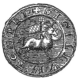 ordinary and extraordinary chapters. The first were composed of the grand preceptors of Scotland and Ireland, and all the provincial priors and preceptors of the three kingdoms, who were summoned once a year to deliberate on the state of the Holy Land, to forward succour, to give an account of their stewardship, and to frame new rules and regulations for the management of the temporalities. * The ordinary chapters were held at the different preceptories, which the Master of the Temple visited in succession. In these chapters new members were admitted into the order; lands were bought, sold, and exchanged; and presentations were made by the Master to vacant benefices. Many of the grants and other deeds of these chapters, with the seal of the order of the Temple annexed to them, are to be met with in the public and private collections of manuscripts in this country. One of the most interesting and best preserved, is the Harleian charter (83, c. 39,) in the British Museum, which is a grant of land made by Brother William de la More, the martyr, the last Master of the Temple in England, to the Lord Milo de Stapleton. It is expressed to be made by him, with the common consent and advice of his chapter, held at the Preceptory of Dynneslee, on the feast of Saint Barnabas the Apostle, and concludes, "In witness whereof, we have to this present indenture placed the seal of our chapter." † A fac-simile of this seal is given above. On the reverse of it is a man's head, decorated with a long beard, and surmounted by a small cap, and around it are the letters TESTISVMAGI. The same seal is to be met with on various other indentures made by the Master and Chapter of the Temple. ‡ The more early seals are surrounded with the