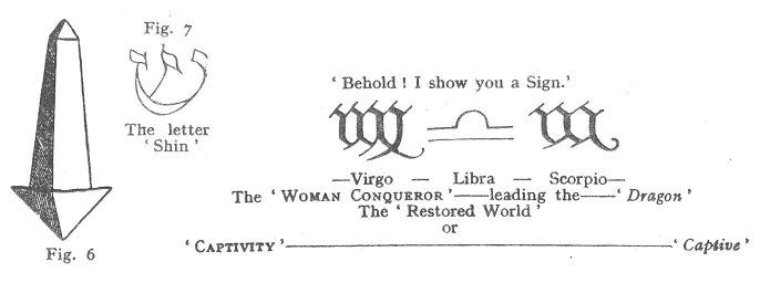The Hebrew letter 'Shin', or 'Sin', counts for 300 in the Hebraic numeration. Each spica, or spike, may be taken to signify 100, or ten tens. We have strong hints here of the origin of the decimal system, which reigns through the universal laws of computation as a natural substratum, basis, or principle. This powerful symbol, also, is full of secret important meanings. It will be remarked as the symbol or figure assigned in the formal zodiacs of all countries, whether original zodiacs, or whether produced in figure-imitations by recognizing tradition. The marks or symbols of the zodiacal signs, 'Virgo-Scorpio', are closely similar to each other, with certain differences, which we recommend to the judicious consideration of close and experienced observers.