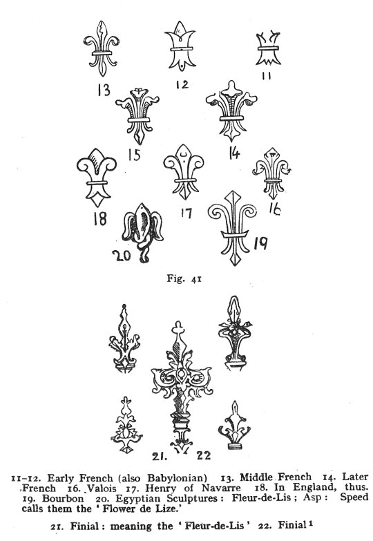 11-12. Early French (also Babylonian) 13. Middle French 14. Later French 16. Valois 17. Henry of Navarre 18. In England, thus. 19. Bourbon 20. Egyptian Sculptures: Fleur-de-Lis; Asp: Speed calls them the 'Flower de Lize.' 21. Finial: meaning the 'Fleur-de-Lis' 22. Finial 1 |