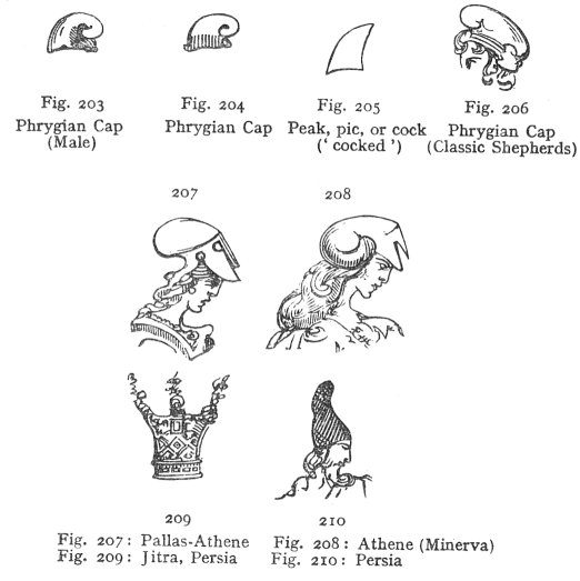 Fig. 203: Phrygian Cap (Male); Fig. 204: Phrygian Cap; Fig. 205: Peak, pic, or cock ('cocked'); Fig. 206: Phrygian Cap (Classic Shepherds); Fig. 207: Pallas-Athene; Fig. 208: Athene (Minerva); Fig. 209: Jitra, Persia; Fig. 210: Persia |