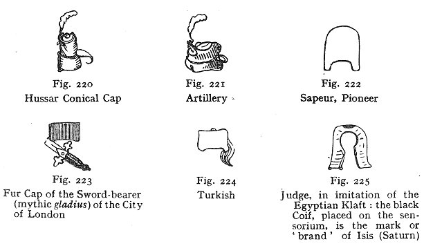 IN the following part of our book we supply, in a series of figures, the succession of changes to which the most ancient head-covering--in itself a significant hieroglyph--the Phrygian cap, the classic Mithraic cap, the sacrificial cap, or bonnet conique, all deducing from a common symbolical ancestor, became subject, The Mithraic or Phrygian cap is the origin of the priestly mitre in all faiths. It was worn by the priest in sacrifice. When worn by a male, it had its crest, comb, or point, set jutting forward; when worn by a female, it bore the same prominent part of the cap in reverse, or on the nape of the neck, as in the instance of the Amazon's helmet, displayed in all old sculptures, or that of Pallas-Athene, as exhibited in the figures of Minerva. The peak, pic, or point, of caps or hats (the term 'cocked hat' is a case .in point) all refer to the same idea. This point had a sanctifying meaning afterwards attributed to it, when it was called the christa, crista, or crest, which signifies a triumphal top, or tuft. The 'Grenadier Cap', and the loose black Hussar Cap, derive remotely from the same sacred, Mithraic, or emblematical bonnet, or high pyramidal-cap. It, in this instance, changes to black, because it is