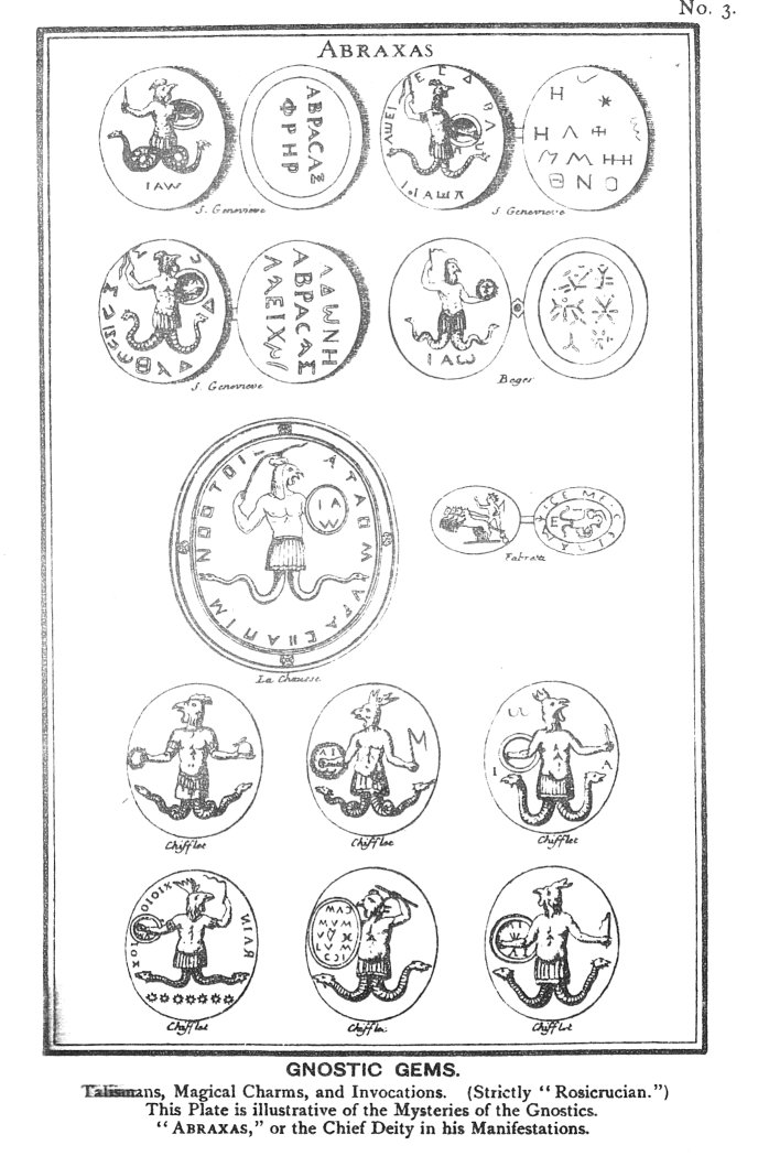 GNOSTIC GEMS. Talismans, Magical Charms, and Invocations. (Strictly "Rosicrucian.") This Plate is illustrative of the Mysteries of the Gnostics. "ABRAXAS," or the Chief Deity in his Manifestations.