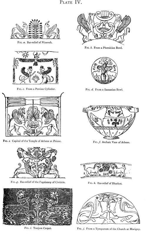127:5 The Tree between two lions facing one another appears already on an ivory casket which Millin attributes to an early period of the Byzantine Empire, and which is now in the p. 128 cathedral of Sens. (Voyage dans les Départements du Midi. Paris, 1807, pl. x. of Atlas.)