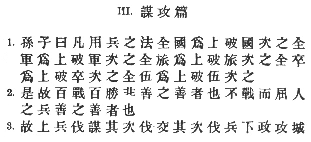 17:2 Here again, no modern strategist but will approve the words of the old Chinese general. Moltke's greatest triumph, the capitulation of the huge French army at Sedan, was won practically without bloodshed.