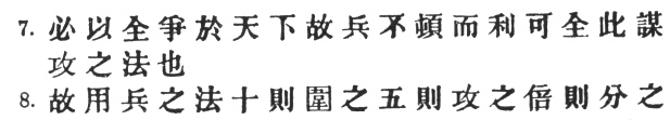 21:2 The T‘u Shu has # instead of #, which is hardly distinguishable in sense from # in the next clause. The meaning, "we can watch the enemy," is certainly a great improvement on the above; but unfortunately there appears to be no very good authority for the variant. Chang Yü reminds us that the saying only applies if the other factors are equal; a small difference in numbers is often more than counterbalanced by superior energy and discipline.
