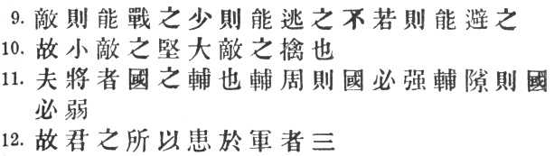 9. If equally matched, we can offer battle; 1 if slightly inferior in numbers, we can avoid the enemy; 2 if quite unequal in every way, we can flee from him.