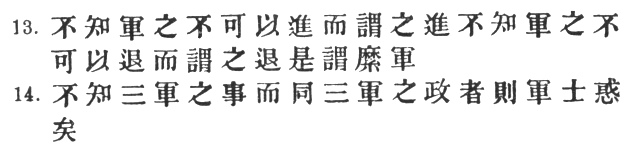 13. (1) By commanding the army to advance or to retreat, being ignorant of the fact that it cannot obey. This is called hobbling the army. 1