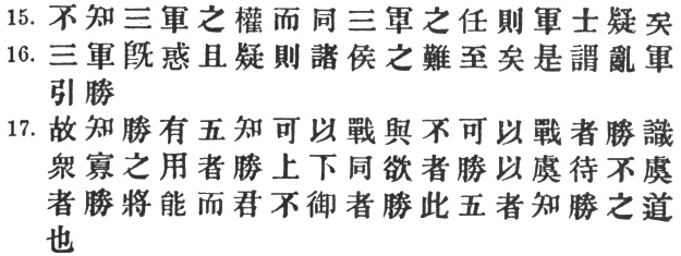 23:2 I follow Mei Yao-ch‘ên here. The other commentators make # etc. refer, not to the ruler, as in §§ 13, 14, but to the officers he employs. Thus Tu Yu says: # "If a general is ignorant of the principle of adaptability, he must not be entrusted with a position of authority." Tu Mu quotes #: "The skilful employer of men will employ the wise man, the brave man, the covetous man, and the stupid man. For the wise man delights in establishing his merit, the brave man likes to show his courage in action, the covetous man is quick at seizing advantages, and the stupid man has no fear of death." The T‘ung Tien reads #, which Tu Yu explains as # "is utterly defeated." Capt. Calthrop gives a very inaccurate rendering: "Ignorant of the situation of the army, to interfere in its dispositions."
