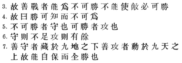 27:4 For #, I retain the sense which it undoubtedly bears in §§ 1–3, in spite of the fact that the commentators are all against me. The meaning they give, "He who cannot conquer takes the defensive," is plausible enough, but it is highly improbable that # should suddenly become active in this way. An incorrect variant in the Yü Lan is #.