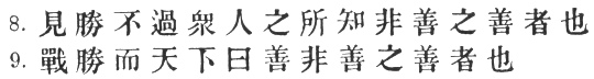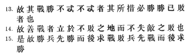 29:3 The original text, followed by the T‘u Shu, has #. But this is an alteration evidently intended to smooth the awkwardness of #, which means literally: "one who, conquering, excels in easy conquering." Mei Yao-ch‘ên says: "He who only sees the obvious, wins his battles with difficulty; he who looks below the surface of things, wins with ease."