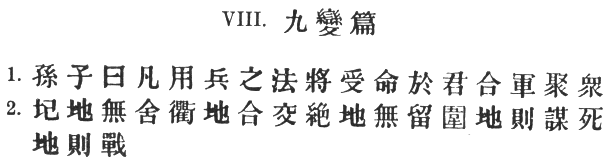 71:1 The heading means literally "The Nine Variations," but as Sun Tzŭ does not appear to enumerate these, and as, indeed, he has already told us (V. §§ 6–11) that such deflections from the ordinary course are practically innumerable, we have little option but to follow Wang Hsi, who says that "Nine" stands for an indefinitely large number. "All it means is that in warfare # we ought to vary our tactics to the utmost degree … I do not know what Ts‘ao Kung makes these Nine Variations out to be [the latter's note is #], but it has been suggested that they are connected with the Nine Situations"—of chap. XI. This is the view adopted by Chang Yü: see note on #, § 2. The only other alternative is to suppose that something has been lost—a supposition to which the unusual shortness of the chapter lends some weight.