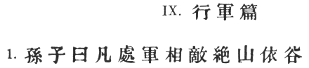 96:1 Capt. Calthrop falls into a trap which often lurks in the word #. He translates: "When both sides, eager for a fight, face each other for a considerable time, neither advancing nor retiring," etc. Had he reflected a little, he would have seen that this is meaningless as addressed to a commander who has control over the movements of his own troops. #, then, does not mean that the two armies go to meet each other, but simply that the other side comes up to us. Likewise with #. If this were not perfectly clear of itself, Mei Yao-ch‘ên's paraphrase would make it so: #, etc. As Ts‘ao Kung points out, a manœuvre of this sort may be only a ruse to gain time for an unexpected flank attack or the laying of an ambush.
