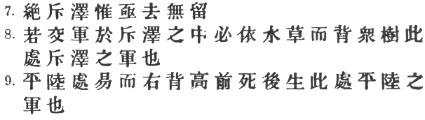 83:2 Li Ch‘üan remarks that the ground is less likely to be treacherous where there are trees, while Tu Yu says that they will serve to protect the rear. Capt. Calthrop, with a perfect genius for going wrong, says "in the neighbourhood of a marsh." For # the T‘ung Tien and Yü Lan wrongly read #, and the latter also has # instead of #.