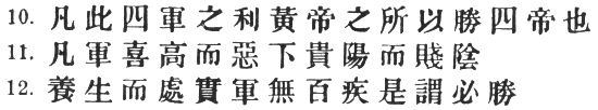 95:5 I follow the interpretation of Ts‘ao Kung: #, also adopted by Li Ch‘üan, Tu Mu and Chang Yü. Another possible meaning, set forth by Tu Yu, Chia Lin, Mei Yao-ch‘ên and Wang Hsi, is: "The general who is first tyrannical towards his men, and then in terror lest they should mutiny, etc." This would connect the sentence with what went before about rewards and punishments. The T‘ung Tien and Yü Lan read # "affection" instead of #.