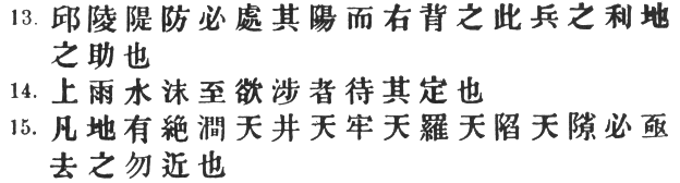 87:2 The original text omits # and #, so that # and # join to make a pair: "ponds and basins." This is plausible enough at first sight, but there are several objections to the : (1) # is unlikely to have got into the text as a gloss on #; (2) it is easy to suppose, on the other hand, that # and afterwards # (to restore the balance of the sentence) were omitted by a copyist who jumped to the conclusion that # and # must go together; (3) the sense, when one comes to consider it, actually requires #, for it is absurd to talk of pools and ponds as in themselves suitable places for an ambush; (4) Li Ching (571–649 A.D.) in his # "Art of War" has the words: #. This is evidently a reminiscence of Sun Tzŭ, so there can be little doubt that # stood in the text at this early date. It may be added that the T‘ung Tien and Yü Lan both have #, and the latter also reads # for #.