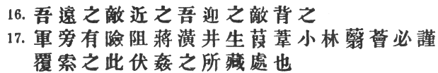 16. While we keep away from such places, we should get the enemy to approach them; while we face them, we should let the enemy have them on his rear.