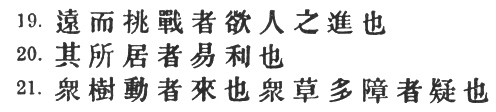 88:2 # is here the opposite of # in § 18. The reading of the T‘ung Tien and Yü Lan, #, is pretty obviously corrupt. The original text, which transposes # and #, may very possibly be right. Tu Mu tells us that there is yet another reading: #.