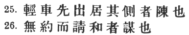 96:2 Wang Hsi's paraphrase, partly borrowed from Ts‘ao Kung, is #. Another reading, adopted by Chia Liu and the T‘u Shu, is # which Capt. Calthrop renders, much too loosely: "Numbers are no certain mark of strength."