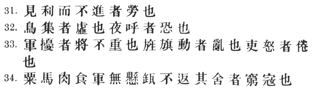 91:1 I follow the original text here, also adopted by the T‘u Shu. The standard text reads # on the strength of Ts‘ao Kung's commentary #, which shows that his text included the word #. Strong as this ground is, I do not think it can counterbalance the obvious superiority of the other reading in point of sense. # not only provides no antithesis to #, but makes the whole passage absurd; for if the language of the enemy is calculated to deceive, it cannot be known as deceitful at the time, and can therefore afford no "sign." Moreover, the extra word in # (an awkward locution, by the way) spoils the parallelism with #.