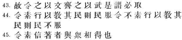 98:2 # and #, according to Ts‘ao Kung, are here equivalent to # and # respectively. Compare our two uses of the word "civil." Yen Tzŭ [† B.C. 493] said of # Ssŭ ma Jang-chü: # "His civil virtues endeared him to the people; his martial prowess kept his enemies in awe." Cf. Wu Tzŭ, ch. 4 init.: # "The ideal commander unites culture with a warlike temper; the profession of arms requires a combination of hardness and tenderness." Again I must find fault with Capt. Calthrop's translation: "By humane treatment we obtain obedience; authority brings uniformity."