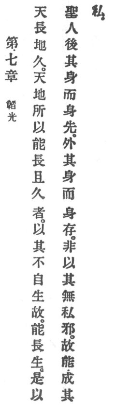 The holy man puts his person behind and his person comes to the front. He surrenders his person and his person is preserved. Is it not because he seeks not his own? For that reason he can accomplish his own.