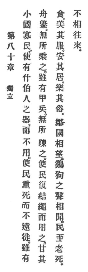 2 Induce people to return to [the old custom of] knotted cords and to use them [in the place of writing], to delight p. 130 in their food, to be proud of their clothes, to be content with their homes, and to rejoice in their customs: then in a neighboring state within sight, the voices of the cocks and dogs would be within hearing, yet the people might grow old and die before they visited one another.