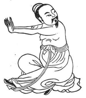 4.—Middle of the Second Month,—termed the "Spring Equinox."—Extend the hands, turn the head to the right and left 6 × 7 times, knock the teeth 6 × 6, inspire and swallow 3 × 3. To cure weakness and the vicious poison of the chest (consumption), shoulders, back, and small blood-vessels, tooth-ache, neck swollen, rigors, feverishness, deafness or ear-ache, tinnitus aurium, pain. behind the ears, pain of the shoulders, elbow, upper arm, and back, oppression in the lungs (fulness), skis feeling like a husk or shell (not painful but itchy).—See Figure, below.