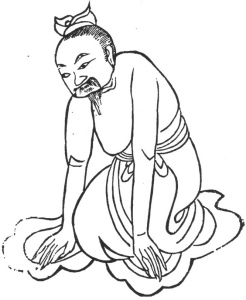 13.—For the Solar Term of the Seventh Month, called "Beginning of Autumn."—Both hands to the ground, contract the body, close the breath, raise up the body in a jerking manner 7 × 8 times, etc. To fill up the empty (weak) and injured parts, to dispel the air of the loins and kidneys collected there, the heart and ribs painful and so unable to turn the body, the face as if covered with fine dust, the outside of the foot hot, head-ache, jaws painful, eyes projecting, canthi painful, sternum and. arm-pits swollen and painful, paroxysms of cold perspiration. (See Figure).