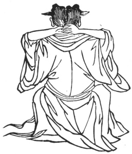 Sit with the back to the outside, and let the two hands embrace the ears and the back of the head. Revolve the air in 12 mouthfuls, and bring the palms together 12 times.